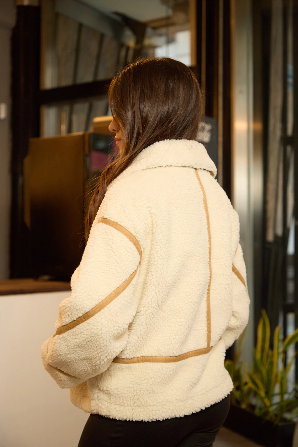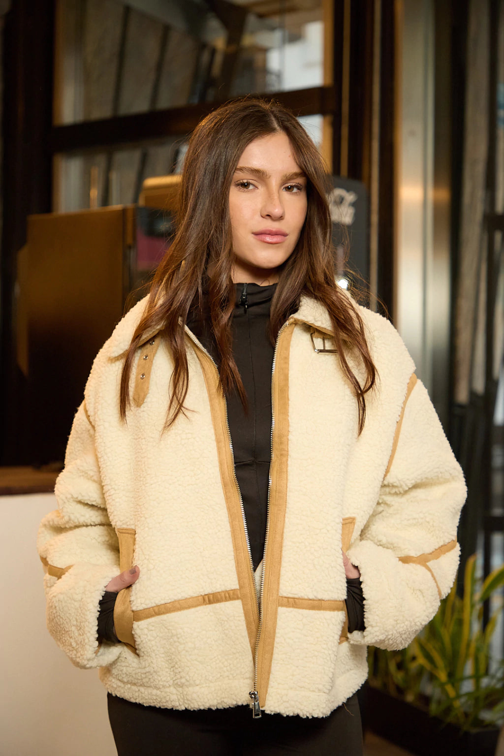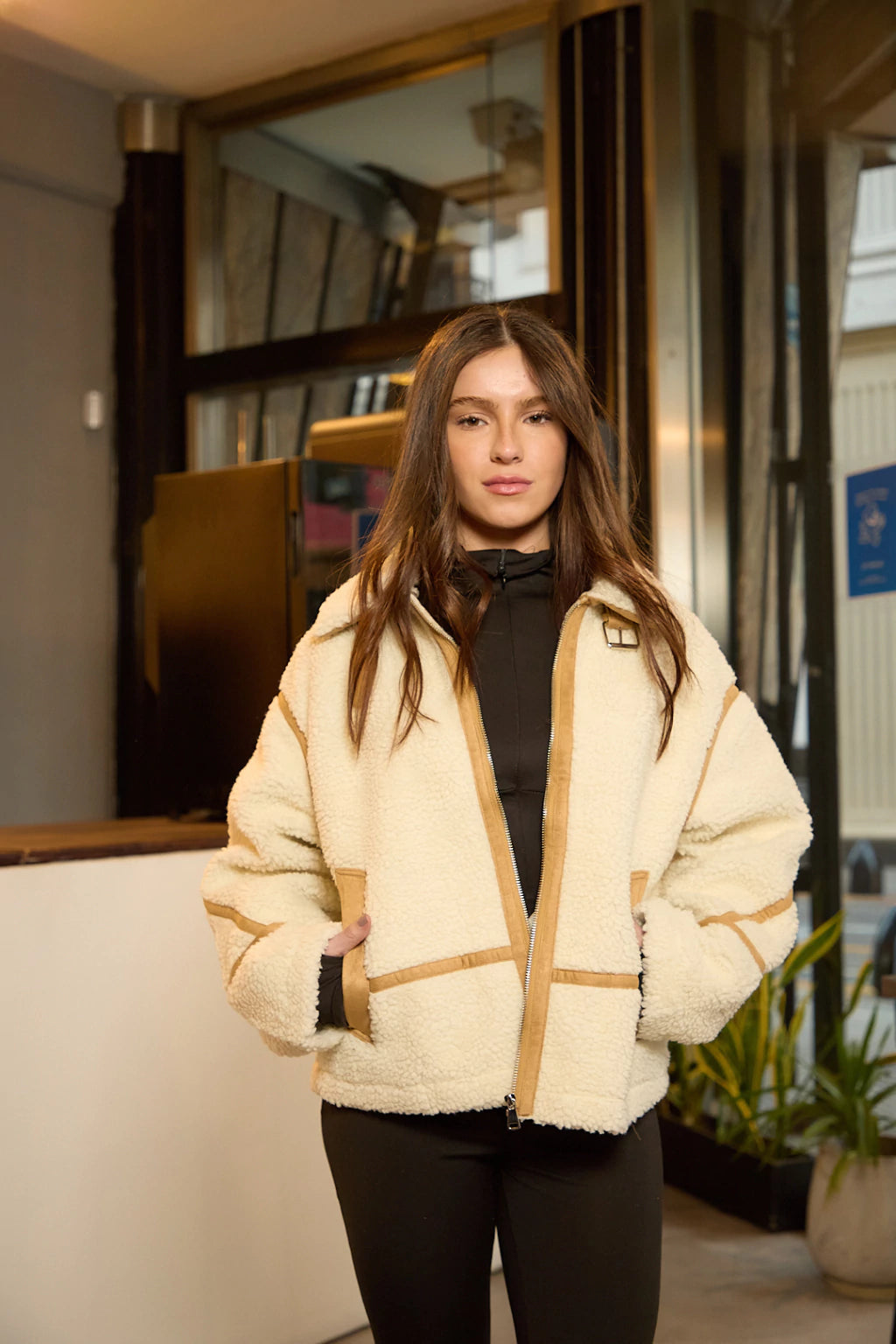 Auréline płaszcz został wykonany z wyjątkowo miękkiego, sztucznego futra i wykończony subtelnymi kontrastowymi detalami, które nadają mu nowoczesny, wyrafinowany charakter.